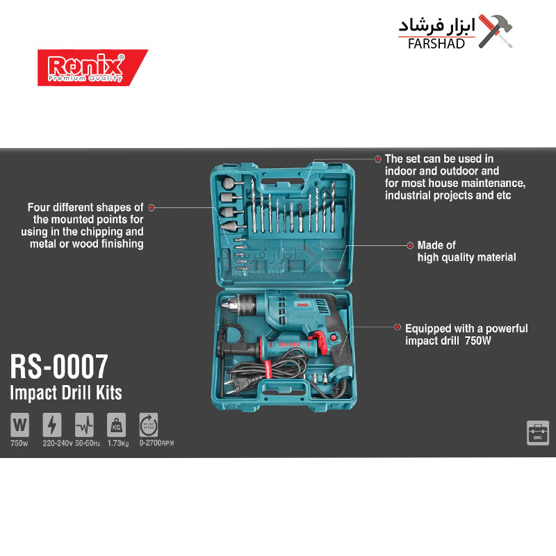 ست ترکیبی رونیکس مدل RS-0007، در یک جعبه رنگی و یک کیف ضد ضربه و محکم BMC همراه با انواع مته و متعلقات زیر به بازار ابزار ایران و جهان عرضه میشود: