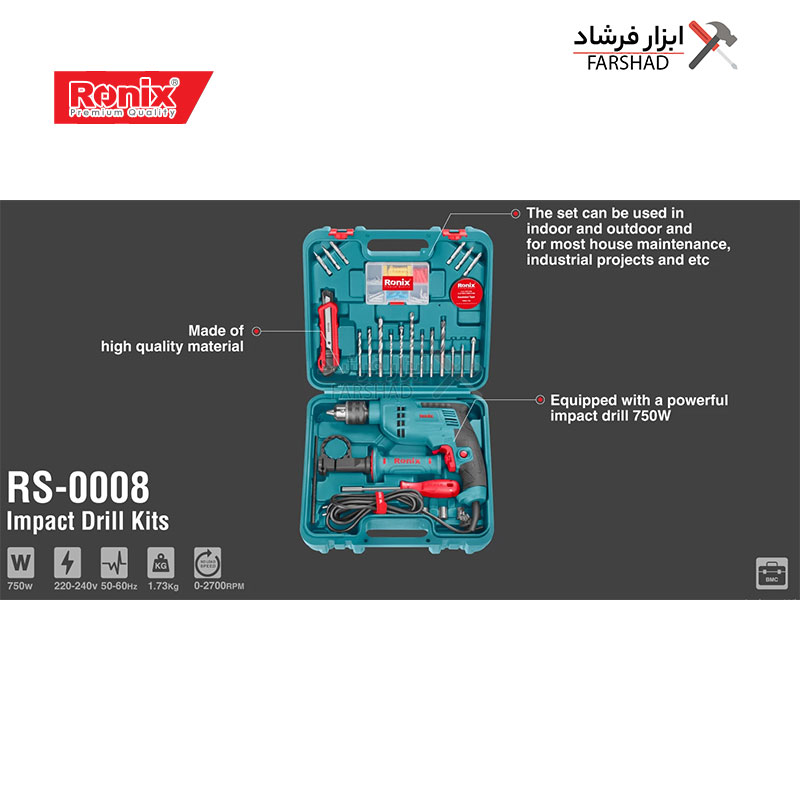ست ترکیبی دریل برقی 33 پارچه رونیکس مدل RS-0008، شامل یک دریل چکشی 750 وات قدرتمند و انواع ابزار دستی و متعلقات مختلف است. این مجموعه کامل و کاربردی، در یک کیف BMC ضد ضربه رونیکس به بازار ابزار ایران و جهان عرضه میشود.